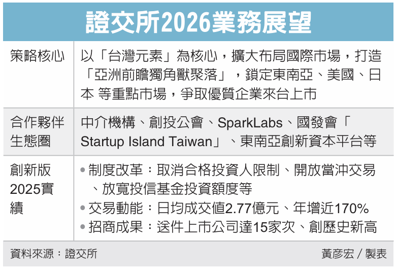 台湾证券交易所表示,展望2026年业务发展,将持续锁定「台湾元素」 扩大布局国际市场,除了与中介机构密切合作开发潜在案源外,并将携手创投公会、SparkLabs、国发会「Startup Island Taiwan」等创新生态圈伙伴,深入接触具潜力成长标的的前瞻产业进入资本市场。