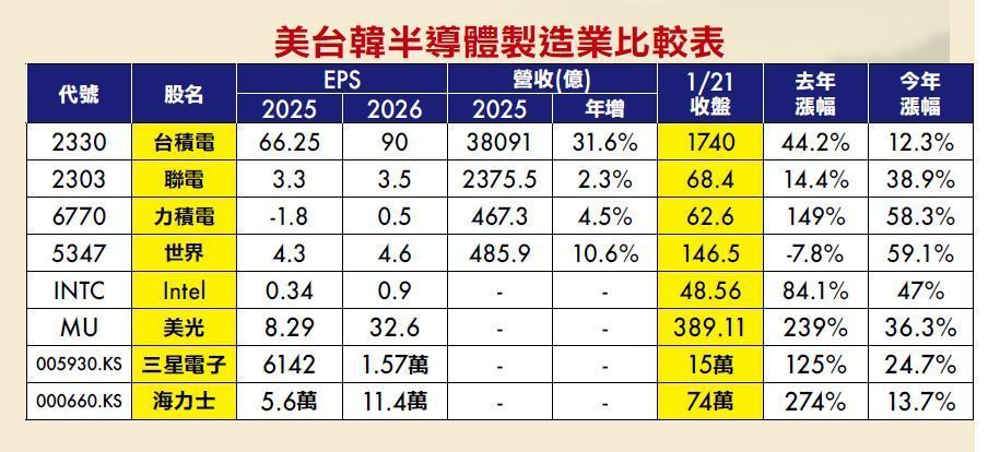 魏哲家霸气回应客户「不会」被Intel松动!强调「竞争不是光靠砸钱就能成功」,但美国政府入股10% Intel,就是川普心中的半导体国家队,去年大涨84%,超过台积电44%近一倍,今年再大涨47%,又比台积电13%超过二倍,股价涨跌不一定反应基本面,台积电的闷就在于反而比不上二线股的大涨!元月至今,Intel、联电、世界先进涨幅都比台积电大。