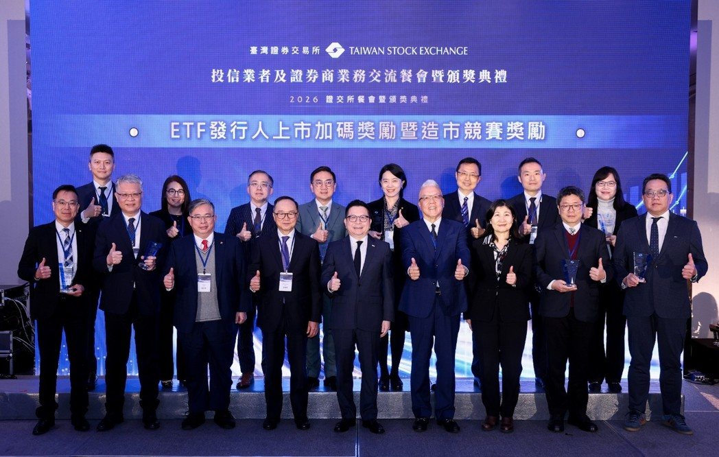 台湾证券交易所为表扬114年发行ETF之投信业者对市场的贡献,以及在ETF造市与交易推动方面表现卓越的证券商,于115年1月26日举办「投信业者及证券商颁奖典礼」,投信投顾公会、证券商公会、投信业者及证券商代表共约150余人出席,场面盛大且气氛热烈。证交所期盼激励业者持续投入ETF商品发展,携手提升我国ETF市场的国际竞争力。
