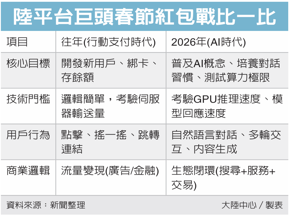 农历春节将至,大陆各平台业者点燃红包战火,不过战场从行动支付转向AI超级入口争夺。今年战局主要由百度、腾讯和字节跳动主导,本质上就是提供一个体验最新AI技术(如豆包、元宝、文心)并顺手拿红包的好机会,红包战已成为各大科技巨头为争夺AI时代超级入口而进行的「诺曼第登陆」。