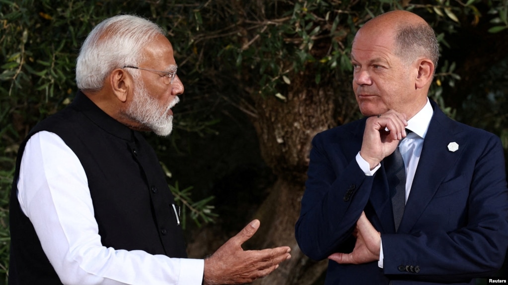 资料照:印度总理莫迪(左)与德国总理朔尔茨在意大利萨维尔特里出席七国集团峰会期间交谈。(2024年6月14日)