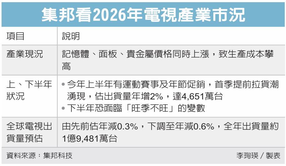 研调机构集邦科技(TrendForce)昨(29)日发布最新报告示警,全球电视产业面临记忆体、面板、贵金属价格同时上涨,致生产成本攀高威胁,预估2026年全球电视出货量将由先前估计年减0.3%,下调至年减0.6%,总出货量估1亿9,481万台,下半年电视需求恐再度面临「旺季不旺」变数。