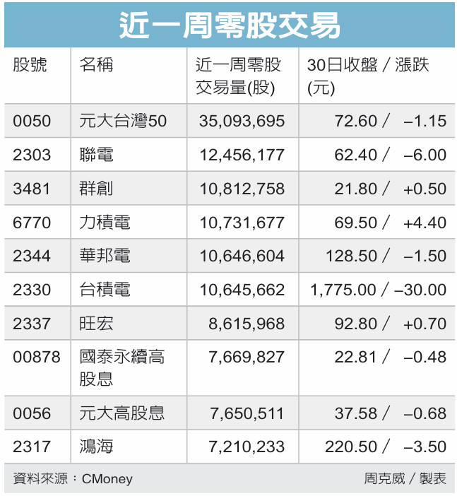 根据CMoney统计,本周热门零股前十强标的依序为,元大台湾50、联电、群创、力积电、华邦电、台积电、旺宏、国泰永续高股息、元大高股息、鸿海,十档标的交易量从3,509万至721万股,较上周增温。