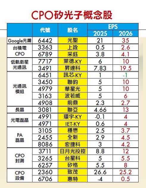 有关Intel授权SuperMM超级电容技术,只有江湖传闻,但联电今年就大涨5成以上,炒翻天就别再追了,反而联电宣称也要投入CPO,就更证实台积电领军的CPO矽光子才是2026主流,参考附表不可忽视,光通讯股王光圣被一家外资估EPS 50元,上看3000元,但国内同业研究报告最多只估32元,万宝估35元,已连三根涨停到1725元天价,拉升全体比价空间;联亚去年赚4.66元,今年上修13元,必成为千金股,此类股比晶圆代工的想像力大多了!