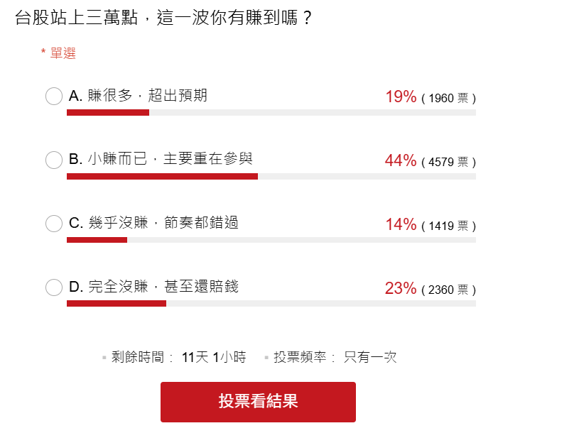 经济日报新闻部新媒体中心日前以「台股站上三万点,这一波你有赚到吗?」为题举办网路投票,投票期间1月21日至2月2日,共吸引约1万名网友参与。投票结果显示,最多人选择的是「小赚而已,主要重在参与」,共4,579票,占比44%,显示多数投资人虽有跟上市场,但获利幅度并不明显。