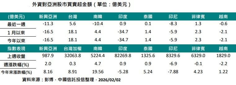 美国总通川普提名联准会(Fed)前理事、偏鹰派的华许(Kevin Warsh)为下任联准会主席,消息一出冲击黄金、白银价格重挫,进一步拖累美国四大指数表现。中国信托投信表示,观察上周资金流,新兴亚洲上周净流出11.3亿美元,外资买卖超互见。其中,韩国遭外资抛售10.4亿美元最重,外资同步卖超印尼8.3亿美元、卖超越南0.6亿美元。另一方面,台股获外资买超5.6亿美元最多,菲律宾、印度、泰国也呈现买超,金额在0.9亿美元至1.3亿美元不等。