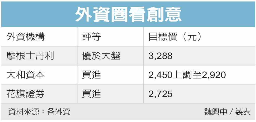 徐祎成上调创意2026-2027年每股税后纯益(EPS)各6%、12%,并认为今年强劲的获利年增表现将支撑较高的估值水准,因此建议「买进」,目标价由2,450元上调至2,920元,调幅19.1%。