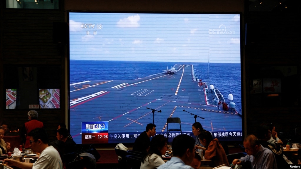 资料照: 民众在北京一家餐馆观看电视屏幕上中国解放军东部战区在台湾周边实施的“联合利剑”演习。(2023年4月10日)