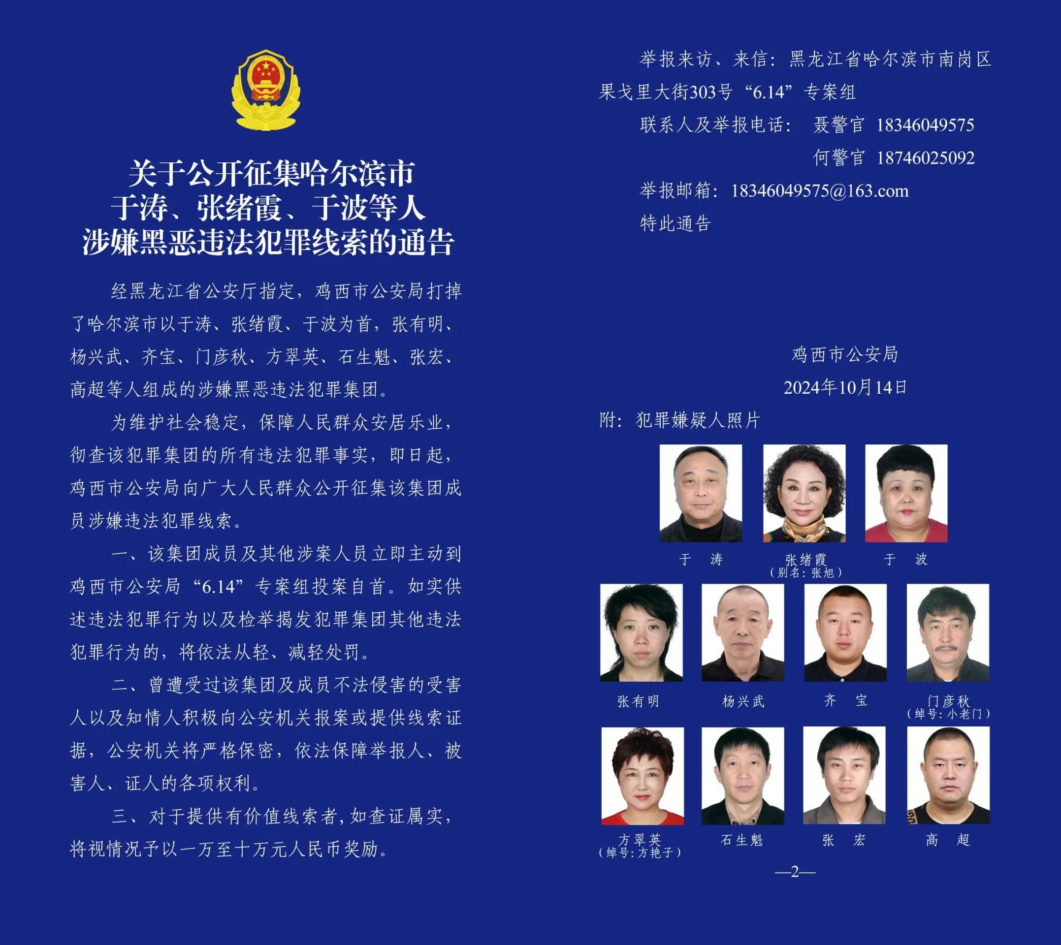 哈尔滨鸡西市公安在官方微信公众号发通告,表示打掉哈尔滨市一个由多人组成的涉黑违法犯罪集团,涉案人包括原公安局副局长于涛、他曾任哈尔滨人大代表的妻子张绪霞,以及于涛的亲姐等多人,并向人民群众公开徵求与该黑社会集团有关的犯罪綫索,承诺会对提供有价值线索的人士给予1万到10万元人民币的奖励。这则消息一出,引发网民的热议,以及包括央视等多家媒体的跟踪报道。