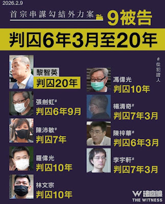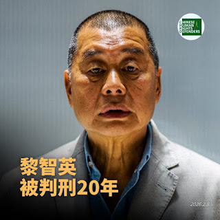 (维权网信息中心报道)202629日,本网获悉:香港著名人权捍卫者黎智英先生今日遭香港法院以勾结外国势力等三项罪名判刑20年。