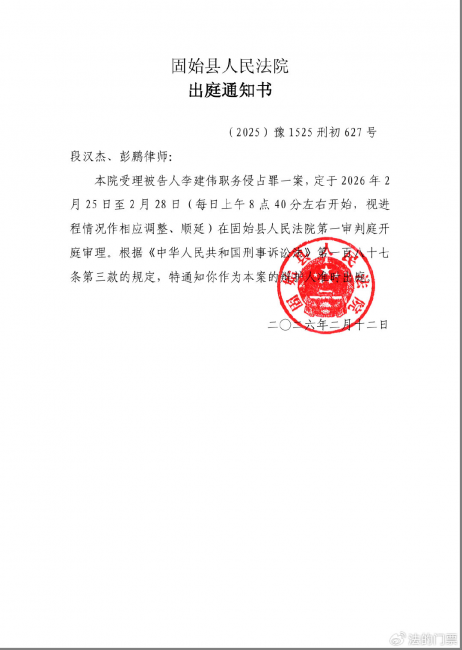 后固始县法院通知召开李建伟案和祝利案的庭前会议,2026年1月26日上午开了祝利案件的庭前会议,2月2日起召开李建伟案件的庭前会议至2月6日,李建伟辩护人当庭详述本案违法分案的问题,强烈要求二案并案,结果2月13日,李建伟辩护人收到固始县法院节后2月25日(大年初八)分案开庭的通知。