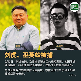 刘虎、巫英蛟此次遭抓捕案件是典型的因言治罪,对此事件,本网还将持续关注。