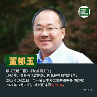 (维权网信息中心报道)2026221日,本网获悉:获刑7年的原《光明日报》评论部副主任董郁玉已入狱4年整。原《光明日报》评论部副主任董郁玉在