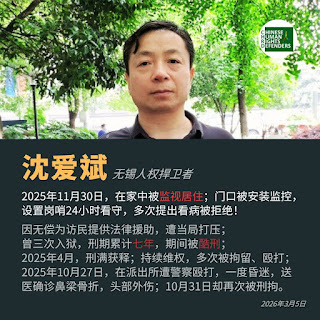 (维权网信息中心报道)202636日,本网获悉:曾多次获刑的江苏无锡人权捍卫者沈爱斌出狱后的基本人权继续遭遇中共当局的蛮横系统性侵害。