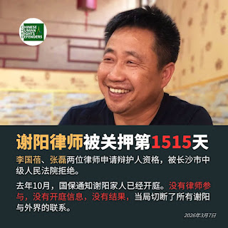 (维权网信息中心报道)2026年3月7日,本网获悉:陈桂秋女士今通报:“李国蓓和张磊两位律师申请辩护人资格,被长沙市中级人民法院拒绝,去年10月某日,国保通知谢阳的家人已经开庭。没有律师参与,没有开庭信息,没有结果,长沙市中级人民法院和长沙市第一看守所切断了所有谢阳与外界的联系。