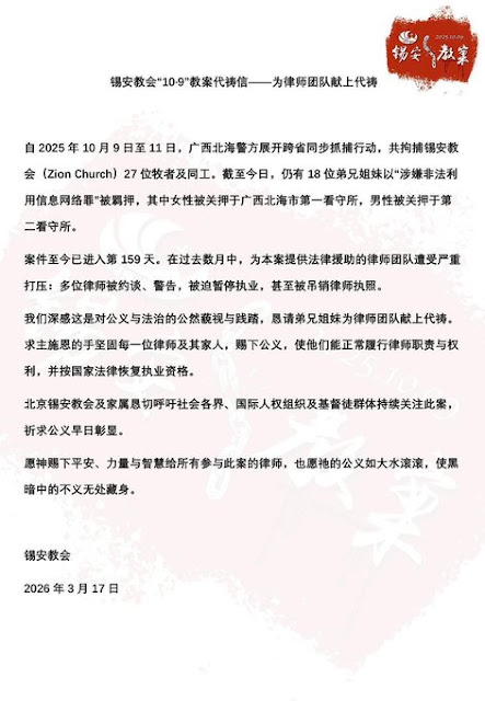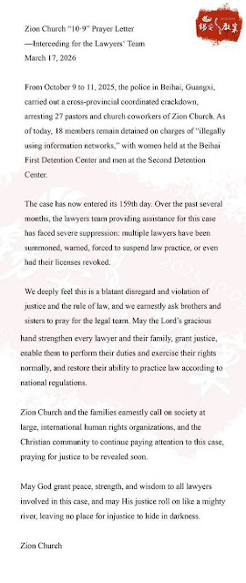 北京锡安教会及家属恳切呼吁社会各界、国际人权组织及基督徒群体持续关注此案,祈求公义早日彰显。