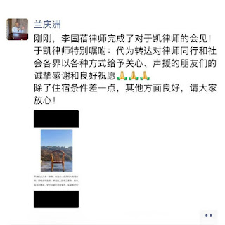 李国蓓律师虽受各方拦阻,据悉还被两位警察打电话约谈,但最终成功会见。遭受羁押的于凯律师特别嘱附:“代为转达对律师同行和社会各界以各种方式给予关心、声援的朋友们的诚挚感谢和良好祝愿 除了住宿条件差一点,其他方面良好,请大家放心!”