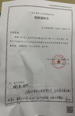 同年11月6日,其妻子谷晓羽聘请律师发控告书,将北海市银海区警方对其丈夫暴力执法和拘留、搜查过程的违法行为向北海市银海区检察院提出控告。目前其被羁押于北海市第二看守所(广西自治区北海市银海区高德镇平阳,邮政编码:536005)。