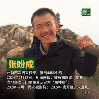 此前张盼成两次因言获罪,服刑46个月;2024213日,刑满获释;被长期跟踪、监视,当地多次上门要将其认定为“精神病”;20247月,再次被刑拘; 2024年底开庭,未宣判。