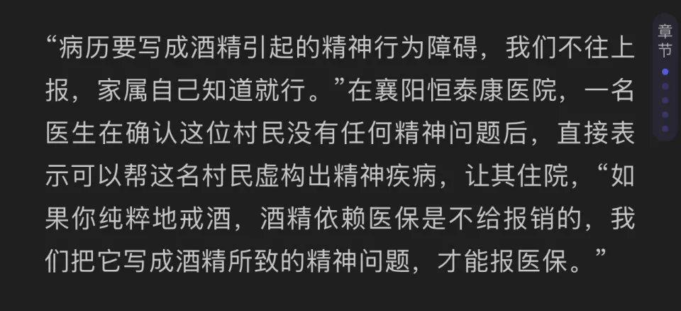 据了解,该医院医生曾在确认一名就诊者没有任何精神问题后,直接表示可以帮这名就诊者虚构出精神疾病,让其住院,“病历要写成酒精引起的精神行为障碍,我们不往上报,家属自己知道就行。”“如果你纯粹地戒酒,酒精依赖医保是不给报销的,我们把它写成酒精所致的精神问题,才能报医保。”