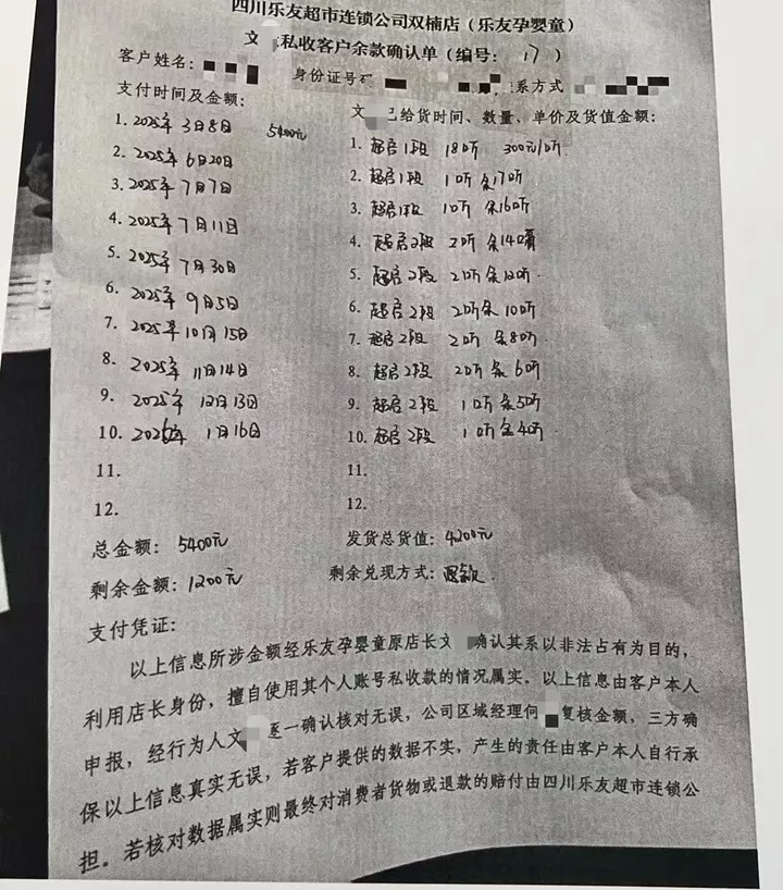 与此同时,一份被消费者视为关键依据的文件——《文某私收客户余款确认单》在维权群中流传。该文件不仅包含涉事店长签字,还显示“公司区域经理何某复核金额”,并附有当地市场监管部门及派出所签字信息,明确写有“最终赔付由四川乐友超市连锁公司承担”。但截至目前,企业尚未对确认单法律效力作出正式说明,部分消费者担忧后续执行情况。