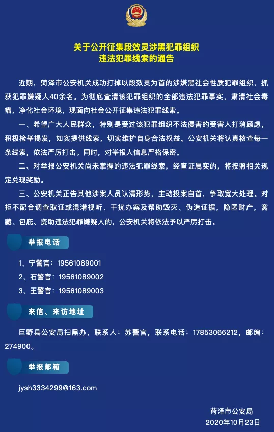 2020年,菏泽市公安局曾发布通告称,菏泽公安成功打掉以段效灵为首的涉嫌黑社会性质犯罪组织,抓获犯罪嫌疑人40余名,并公开征集段效灵涉黑犯罪组织违法犯罪线索。