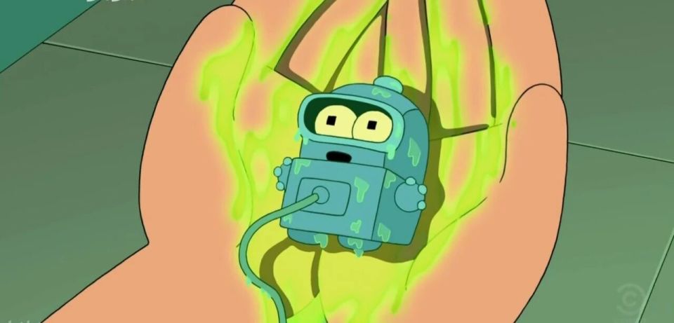 AI是由人类孕育出的另一种生命形态,也许有天AI也会具有人类的权利。《飞出个未来》剧照。