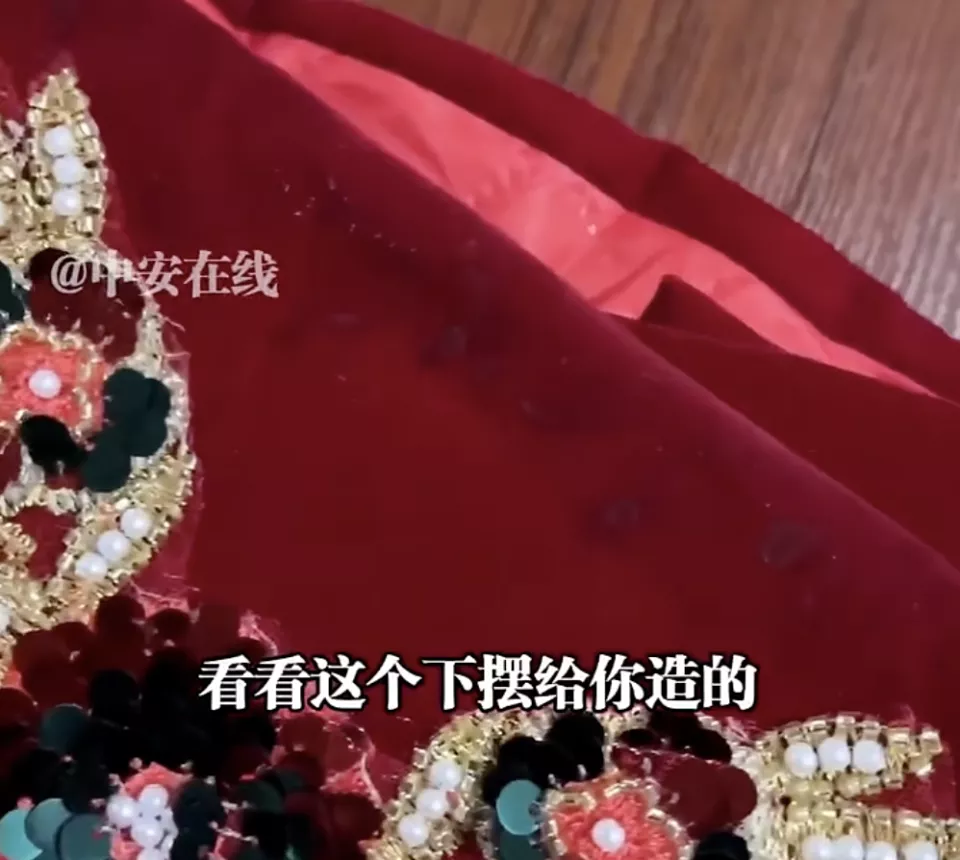 商家还展示了已经穿脏的衣服下摆并调侃:“我不知道你嫁得好不好,但这个地方的路一定不好走,看这个下摆给你造得”。