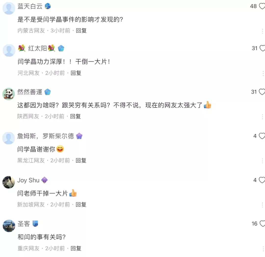 点进去一看,满屏都是“闫学晶功力深厚”“闫老师干掉一大片”的群众贺电,不知道的还以为是文艺界评劳动模范。