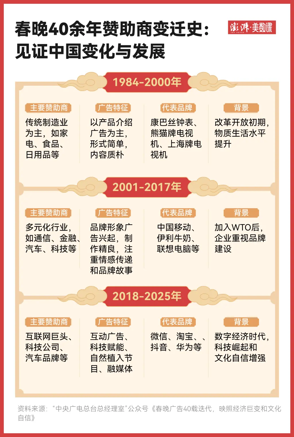 作为国民级文化符号,总台春晚的广告位历来是市场发展的风向标,各个阶段的核心广告主,也对应不同阶段的商业风口。