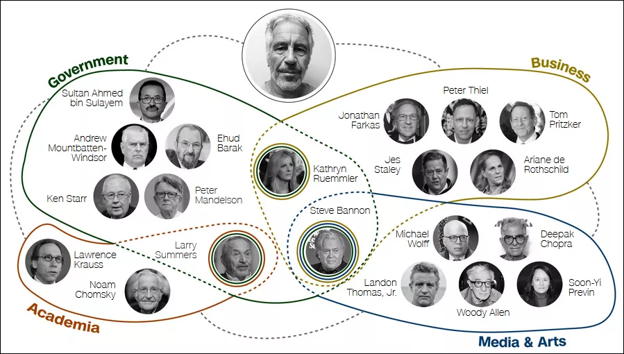 这些文件以毫不留情的细节揭示了一个曾经隐秘的、不受问责的精英群体的活动,该群体主要由来自政界、商界、学界和娱乐界的那些富有且有权势的男性组成。档案讲述的是一个令人发指的罪犯在其所处统治阶层中一路通行无阻的故事,这一切都因为他能为他们提供——金钱、人脉、奢华晚宴、私人飞机、隐秘岛屿,以及在某些情况下的性交易。