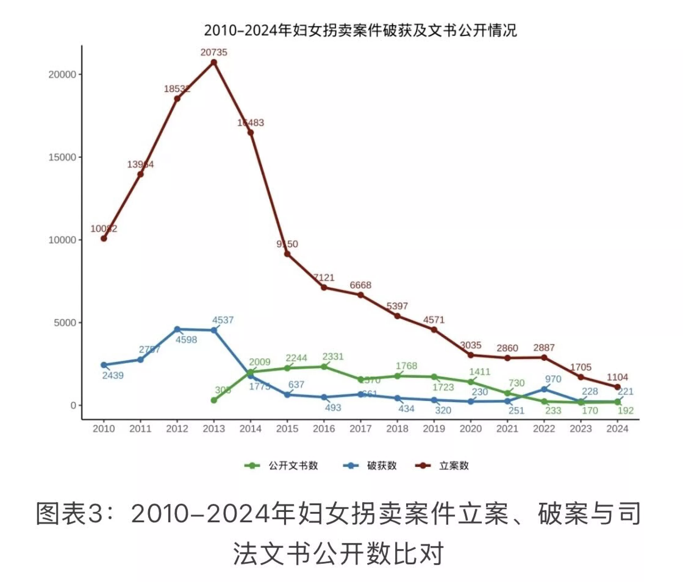 从更宽的时间跨度看,拐卖妇女案件的立案数在2010-2013年间出现激增,在14年后陡然下降,然而立案数与破案数之间存在跨越数量级的差距。我们无从知晓这一悬殊的具体因由,让人担忧的是,尽管近年来从官方数据看拐卖妇女案件的数量似乎有所放缓,政府也乐观表示“拐卖妇女犯罪整体呈下降态势”【4】,但数据上显示的过往的大量积案是否告破?如果答案是否定的,这些案件终将如何被处置?