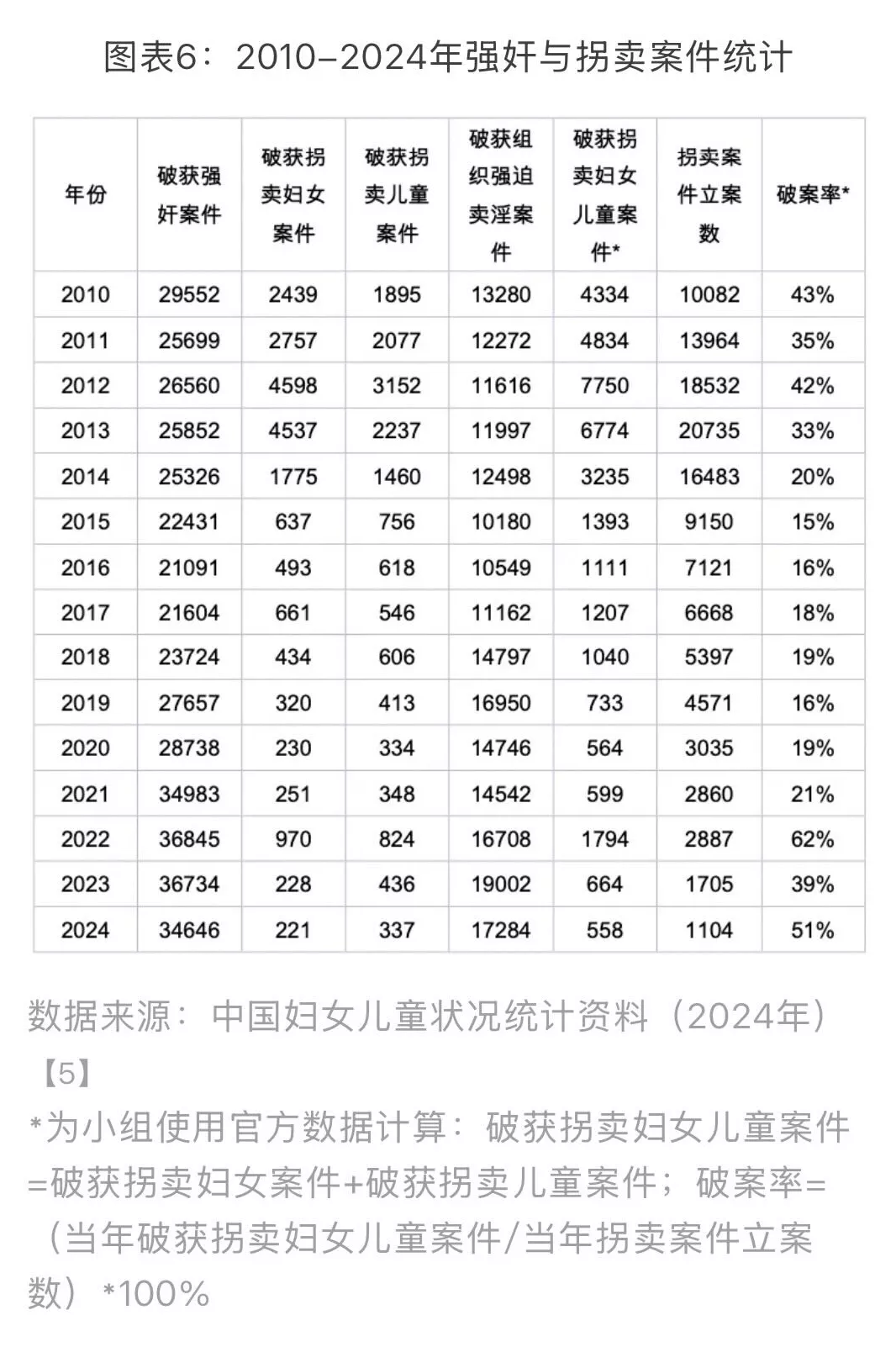 2024年官方公开的拐卖案件以单次犯案居多,多发地在农村,罪犯背景集中于中年及老年男性,教育水平多为初中及以下;而受害者多为女性,尤其是精神或心智障碍女性以及外籍女性。在铁链女事件发生的2022年,政府对拐卖妇女儿童类案件的打击与侦破有显著的提升,但22年以前及以后的力度都稍显不足,这可能与统计方法及口径、政府的执法与司法资源分配、拐卖案件治理结构变动有关,对此我们不得而知。