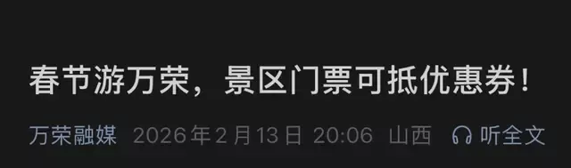 2月21日,华商报大风新闻记者从“万荣融媒”公众号查询到,2月13日的“春节游万荣,景区门票可抵优惠券”一文中,提及“游客凭当日万荣任意景区门票、电子门票,可在县域内合作酒店、餐饮单位、出租车消费时享九折优惠”。