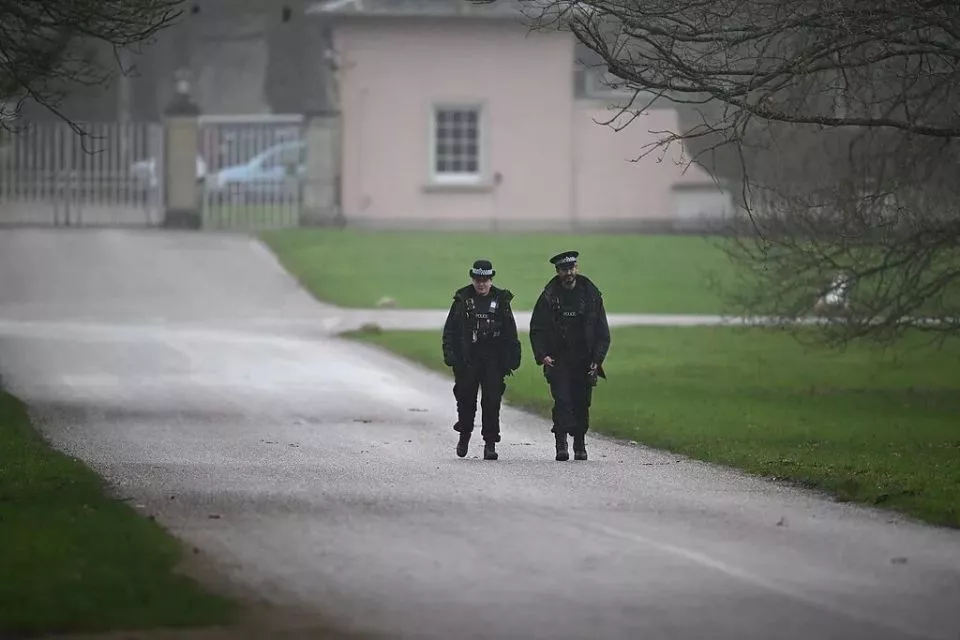 当地时间2026年2月20日,英国温莎,警察从皇家小屋的大门沿着车道行走。皇家小屋是安德鲁在温莎大公园的前住所。图/视觉中国