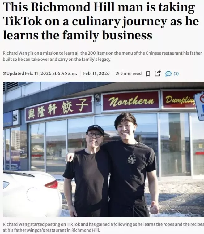 根据《多伦多星报》的报道,这位年轻的华裔青年人正立下一个目标——学会餐厅菜单上的全部200道菜,好让父亲安心退休,将家族事业传承下去。