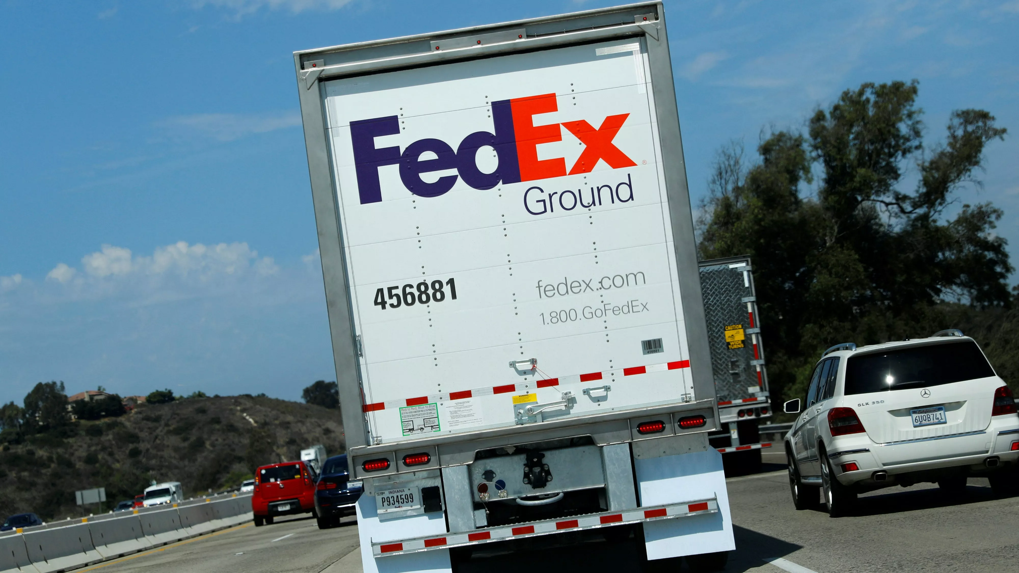 2019年9月16日,美国加州卡尔斯巴德(Carlsbad),一辆联邦快递(FedEx)地面运输公司的货车在一条高速公路上行驶。(Reuters)
