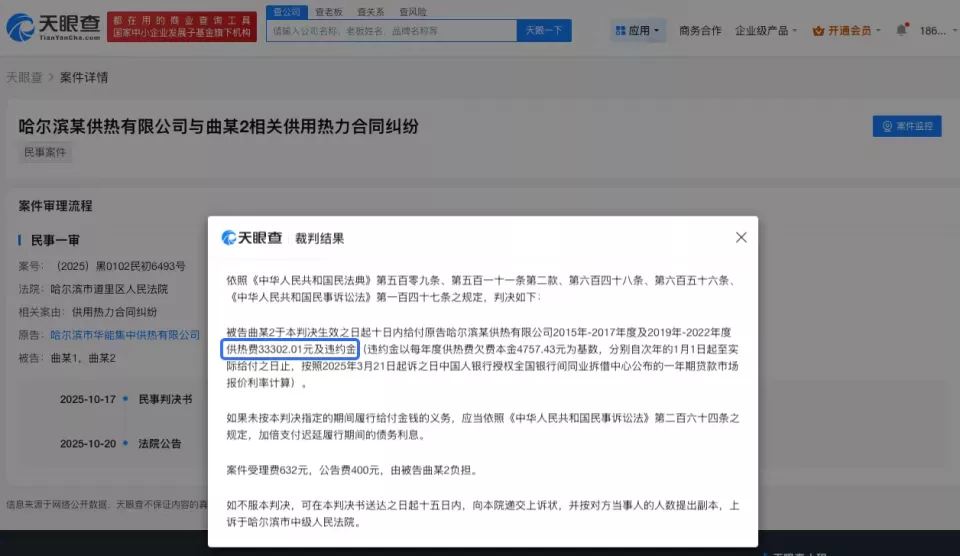 天眼查App显示,2025年12月,法院公开供热公司起诉曲婉婷供用热力合同纠纷民事一审判决书。法院查明,曲婉婷名下该处房产因案外人张某某(张明杰)追缴违法所得、没收财产一案,于2022年被裁定查封。法院判决,曲婉婷给付供热公司2015年—2017年度及2019年—2022年度供热费33302.01元及违约金。
