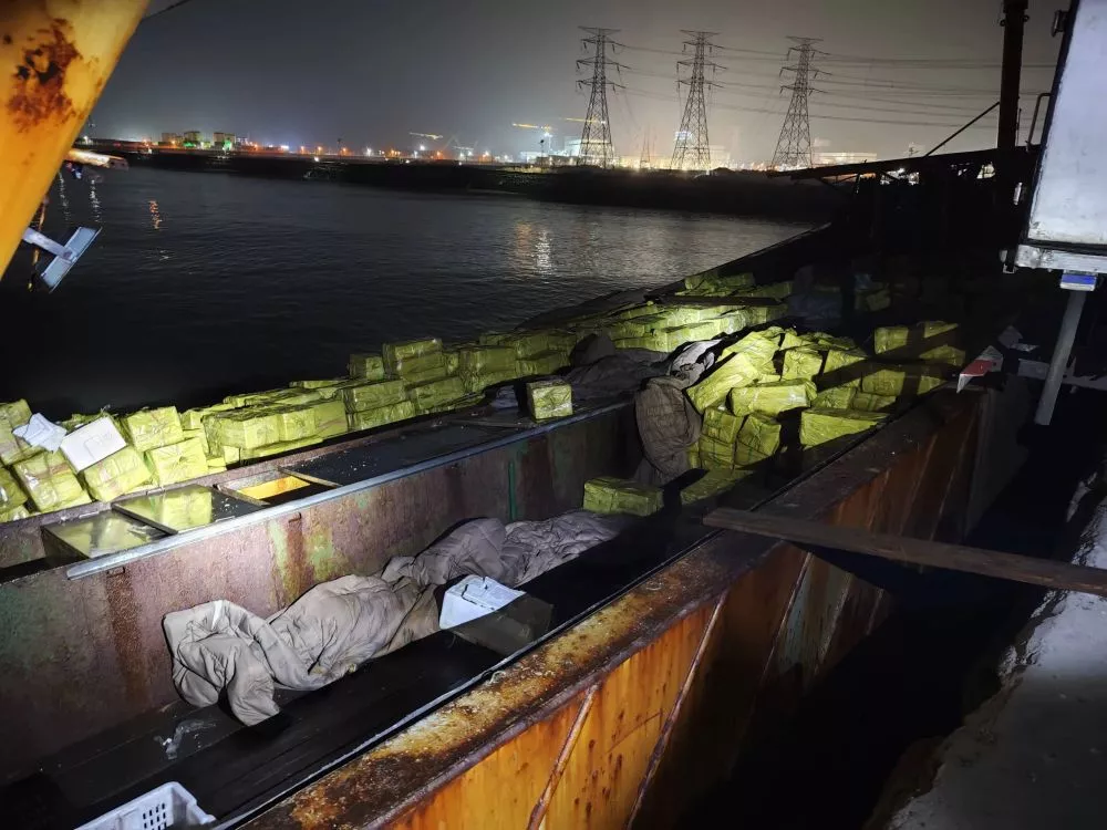 行动前,该局通过海洋智能态势感知系统研判线索,通过轨迹追踪、蹲点摸排等方式,全面掌握涉案船舶活动规律与上岸卸货时机,周密部署行动。行动中,海警执法员快速封锁码头出入口,同步登船检查与现场控制,当场锁定船名号为粤某渔XX号的涉案散货船。经现场清点,船上装载箱装鲜活夏贻贝、雪蛤等海产品100余吨,均无法提供合法凭证,涉嫌走私。案件正在进一步侦办中。