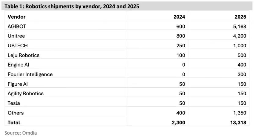 看个数据就知道了,宇树 2025 年全年人形机器人实际出货量超 5500 台,多份研报显示智元机器人的出货量,约为 5200