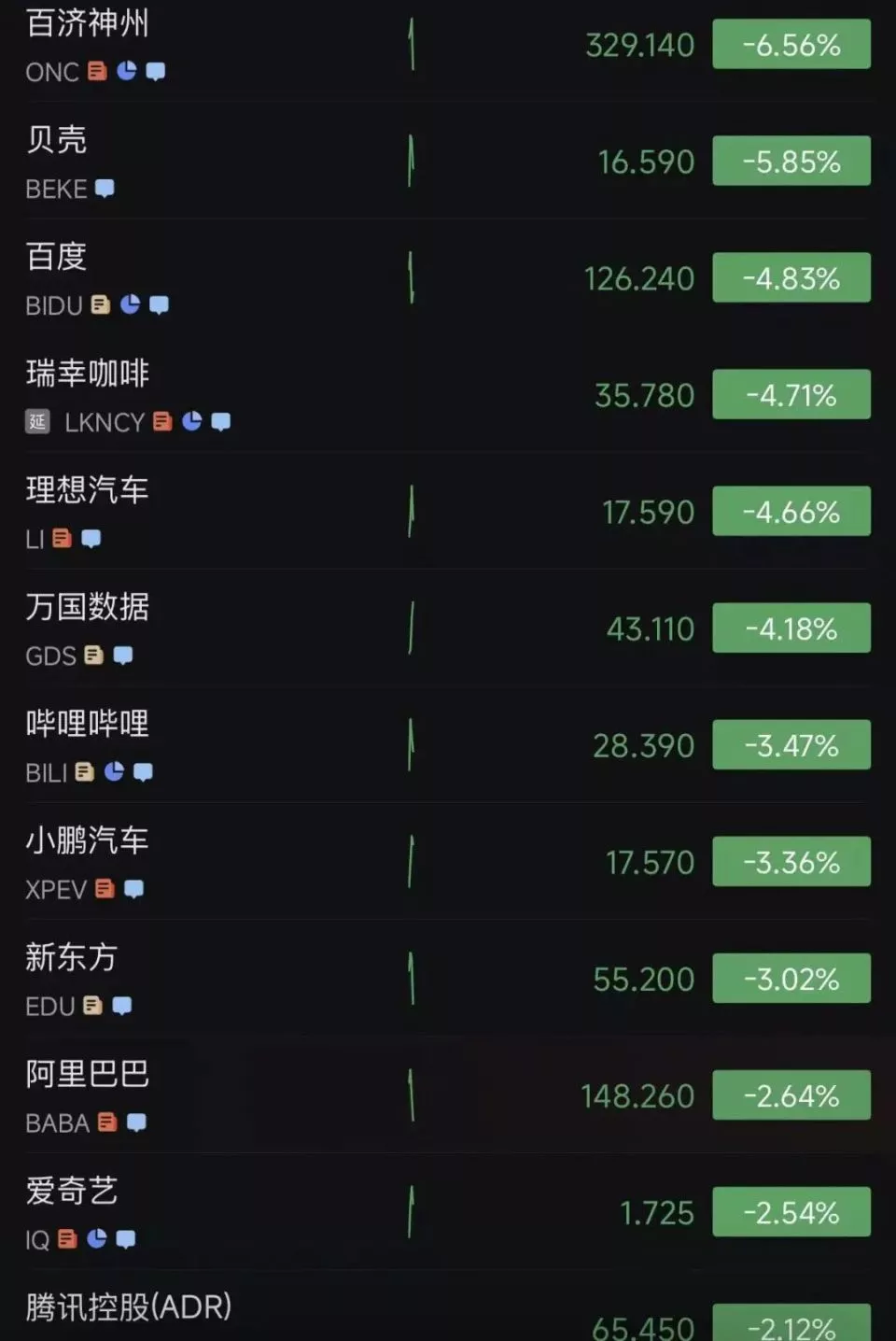 热门中概股多数下跌,截至发稿,百济神州跌6.56%,贝壳跌5.85%;百度跌4.83%,公司2025财年营收同比减少3%;瑞幸咖啡跌4.71%,理想汽车跌4.66%,哔哩哔哩跌3.47%。