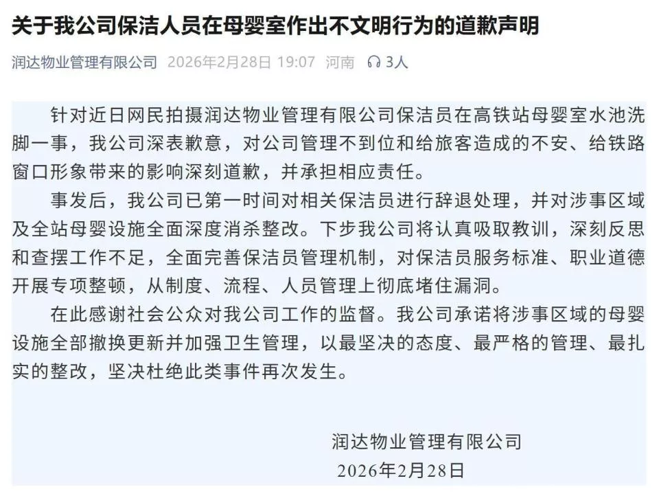 此前一天晚上,润达物业管理有限公司在微信公众号发布道歉声明。内容显示,对于公司保洁员在高铁站母婴室水池洗脚一事,该公司深刻道歉,并承担相应责任。事发后,该公司已辞退处理相关保洁员,并对涉事区域的母婴设施全部撤换更新并加强卫生管理,同时对全站母婴设施全面深度消杀整改,坚决杜绝此类事件再次发生。
