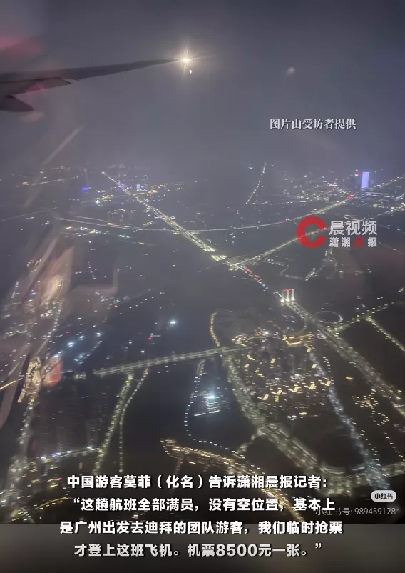 中国游客莫菲(化名)告诉潇湘晨报记者:“这趟航班全部满员,没有空位置,基本上是广州出发去迪拜的团队游客,我们临时抢票才登上这班飞机。机票8500元一张。”莫菲回忆,能顺利回国,还是朋友凌晨把她叫醒抢票:“神仙朋友,关键时刻救命般的存在。”