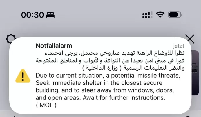 当地时间3月1日凌晨,沈女士第一次收到手机警报。和前台确认,前台表示“只是警报”。半个小时之后,炮弹打在了她所在的楼层。(图源受访者)