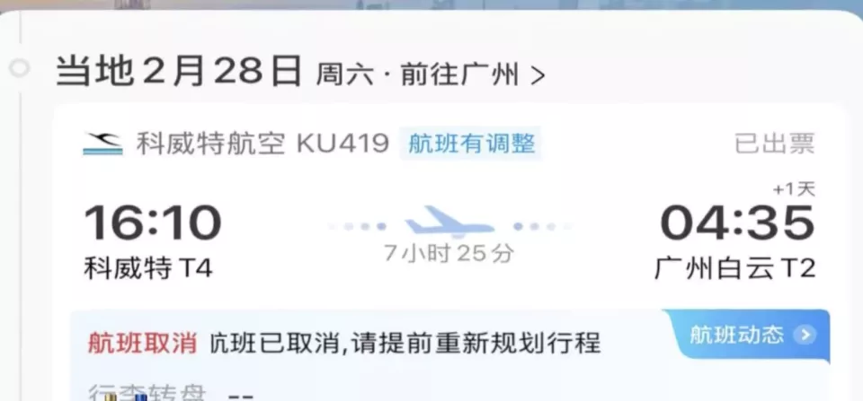 今年春节假期广东市民春哥带家人前往迪拜度假,原计划在当地时间2月28日下午4点10分搭乘科威特航空KU419返回广州白云国际机场,没想到出发前收到了航司通知航班取消了,行程被迫中断。