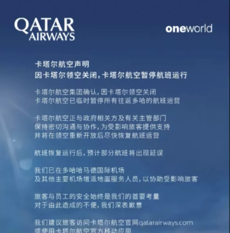 随着局势恶化,2月28日,以色列机场管理局称,已关闭以色列领空对民用航班的开放,呼吁公众不要前往以色列机场。卡塔尔、阿联酋等多个国家领空随后也依次宣布关闭领空或部分领空,航班取消。卡塔尔航空发布公告称,因卡塔尔领空关闭,卡塔尔航空暂停航班运行。