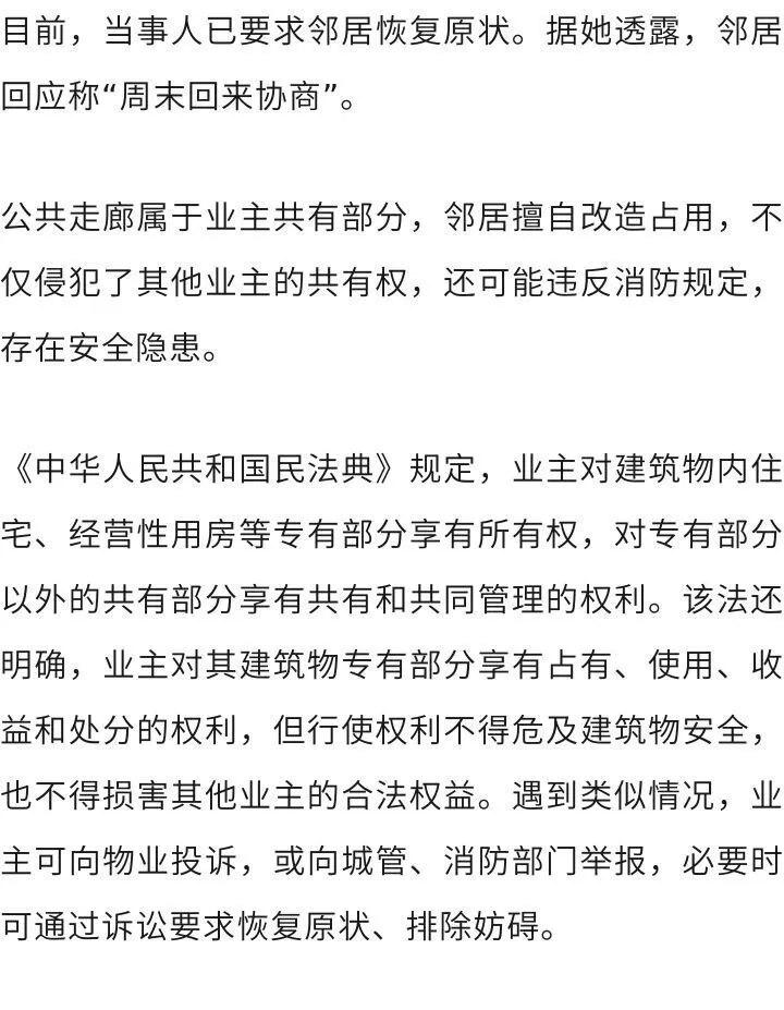 闲置半年的房子,回去一看,差点以为走错了门——自家还在,但门口的公共走廊,已经“升级”成了邻居家的一居室。内蒙古的一位女子就遭遇了这一幕。