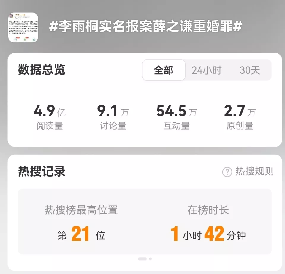 据悉,李雨桐曾在3月2日晚发布涉及薛之谦的微博,相关话题引发网友热议,“李雨桐实名举报薛之谦重婚罪”“李雨桐喊话薛之谦”等词条登上热搜榜。