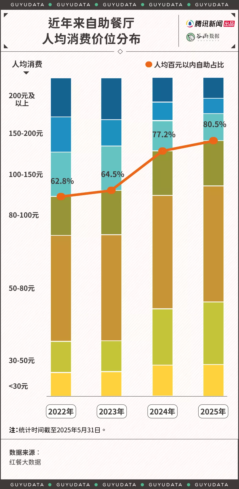 2022年,人均百元以内的自助餐厅占比仅六成出头。到2025年,这一比例已接近八成。