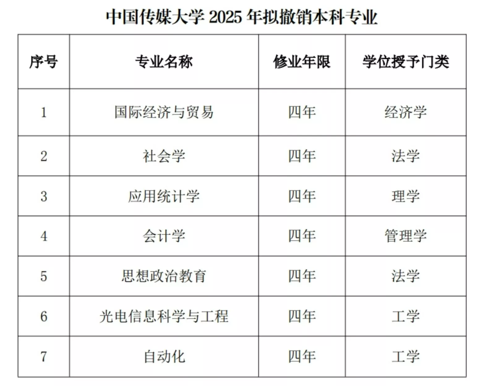 中国传媒大学于2025年已撤销7个本科专业。